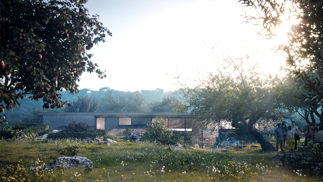 From the existing olive trees distributed chaotically across the rocks, that connect to form a stone shelter for the house, to the combination of wood and fair faced white artisanal concrete used in the interior, create a stone masculine fortress on the outside and a feminine, spiritual and soft space from the inside.